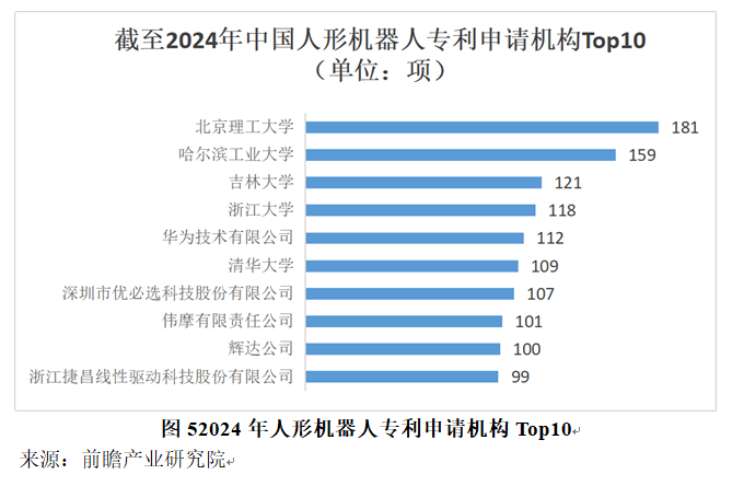 根据incoPat数据,2023年以来中国人形产业专利公开进入爆发阶段。截至2024年,我国共有人形机器人有效发明专利652件,其中长三角地区有效发明专利数量合计占全国比重达到33.3%,粤港澳紧随其后,数量占比为24.2%。京津冀地区的有效发明专利主要集中于北京,占全国的20.2%。根据前瞻研究院数据,截至2024年中国人形机器人专利申请机构TOP10中,北京理工大学以181项的优势占据榜首。