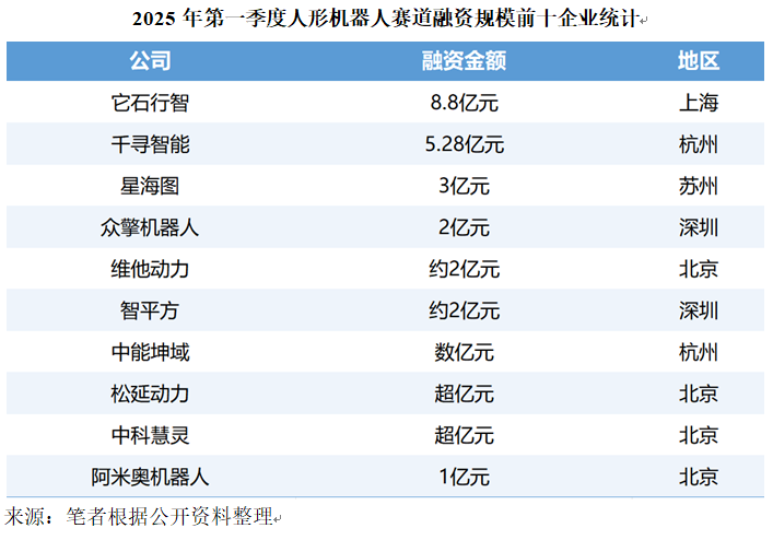 从融资实力方面来看,据不完全统计,2025年第一季度,国内人形机器人赛道的相关融资事件约37笔,已披露的融资金额约35亿元,相比于2024年前11个月同领域的49笔融资事件,2025年第一季度的融资事件数量就已经达到去年11个月的70%。第一季度融资涉及33家企业,成立地点集中于北京、深圳和长三角,其中上海的企业最多,共10家,北京和深圳分别为8家和7家,杭州3家,其余地区均为1家。