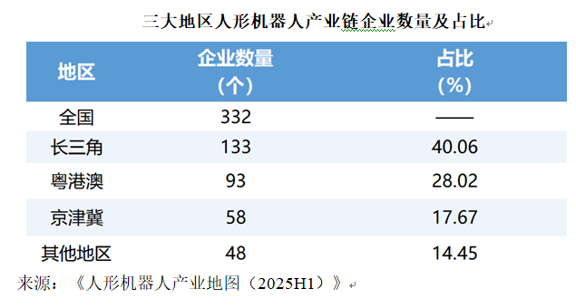 根据高工机器人产业研究所(GGII)发布的《人形机器人产业地图(2025H1)》统计,目前我国共有人形机器人产业链企业332个。其中长三角数量最多为133家,粤港澳和京津冀分别为93家和58家。长三角企业数量以绝对优势占全国的40.06%。